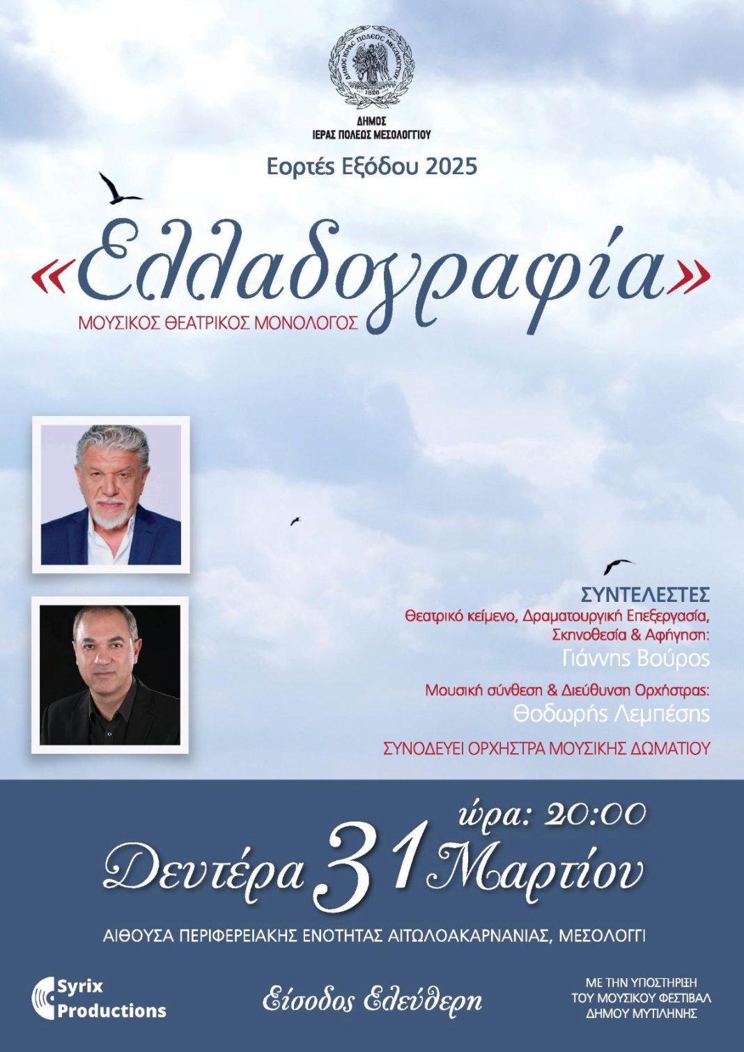 Μουσικός θεατρικός μονόλογος «Ελλαδογραφία» στο πλαίσιο των Εορτών Εξόδου 2025