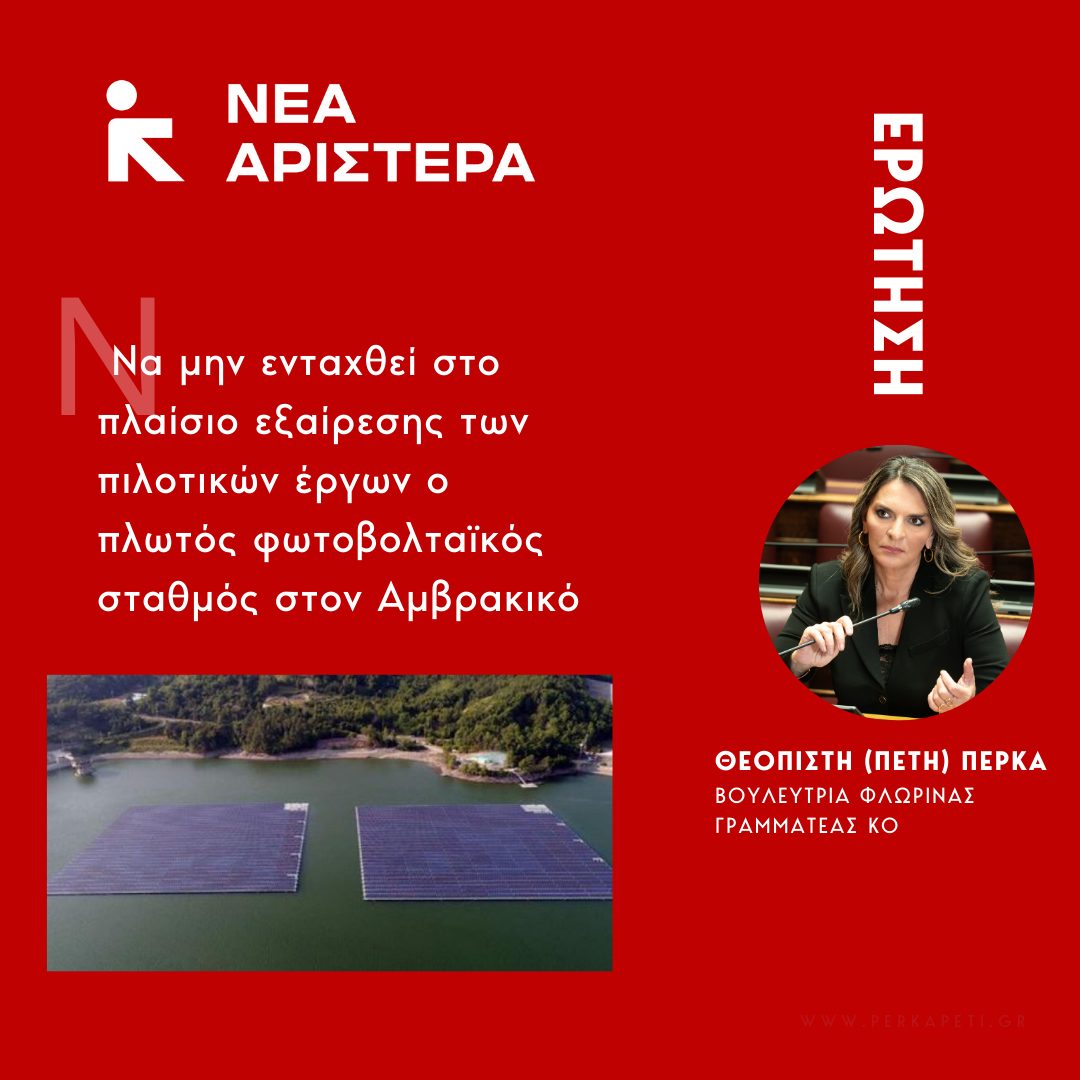 Την έντονη αντίδραση περιβαλλοντικών και κοινωνικών φορέων έχει προκαλέσει η αίτηση εγκατάστασης πλωτού φωτοβολταϊκού στον Αμβρακικό Κόλπο. Την αίτηση, όπως φαίνεται και στον σχετικό γεωπληροφοριακό χάρτη της Ρυθμιστικής Αρχής Αποβλήτων Υδάτων και Ενέργειας (ΡΑΑΕΥ), έχει καταθέσει η εταιρεία με την επωνυμία «Δυτικός Ενεργειακός Κόμβος- Κοινότητα ΑΠΕ-ΕΠΕ», πρόκειται για φωτοβολταϊκό σταθμό ισχύος 7 MW και θα καλύπτει την περιοχή την περιοχή από το Φανάρι (Πλατανάκι)–Ρούγα έως την περιοχή μπροστά από Μπούκα και Αμφιλοχία.