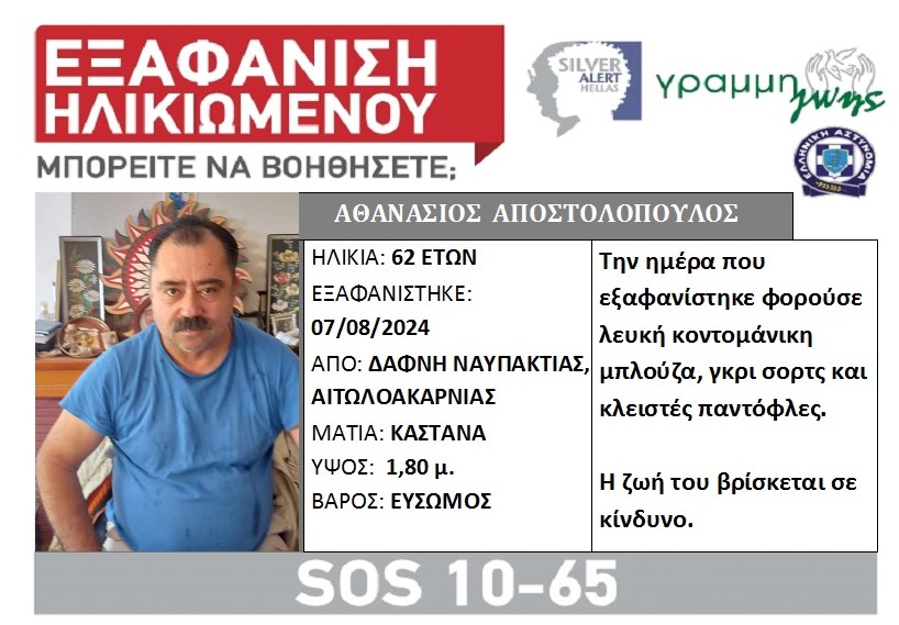 Ο Αθανάσιος Αποστολόπουλος, 62 ετών, εξαφανίστηκε από το σπίτι του, στη Δάφνη Ναυπακτίας του νομού Αιτωλοακαρνανίας, την 07-08-2024.