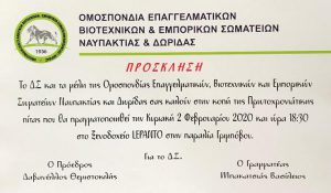 Το ΔΣ της της Ομοσπονδίας Επαγγελματικών, Βιοτεχνικών και Εμπορικών Σωματείων Ναυπακτίας & Δωρίδας καλεί στην κοπή της Πρωτοχρονιάτικης πίτας που θα πραγματοποιηθεί τη Κυριακή 2 Φεβρουαρίου 2020 και ώρα 18:30 στο Ξενοδοχείο LEPANTO, στη Ναύπακτο.