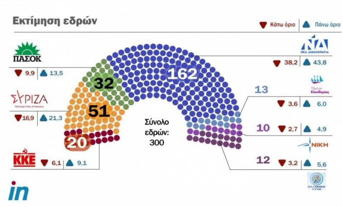 Σαρωτική θα είναι η επικράτηση της ΝΔ στο κοινοβούλιο αν επιβεβαιωθούν τα παραπάνω ποσοστά. Συγκεκριμένα η ΝΔ μπορεί να πάρει 162 έδρες, ο ΣΥΡΙΖΑ 51, το ΠΑΣΟΚ 32, το ΚΚΕ 20, η Ελληνική Λύση 12, η Πλεύση Ελευθερίας 13 και η Νίκη 10.