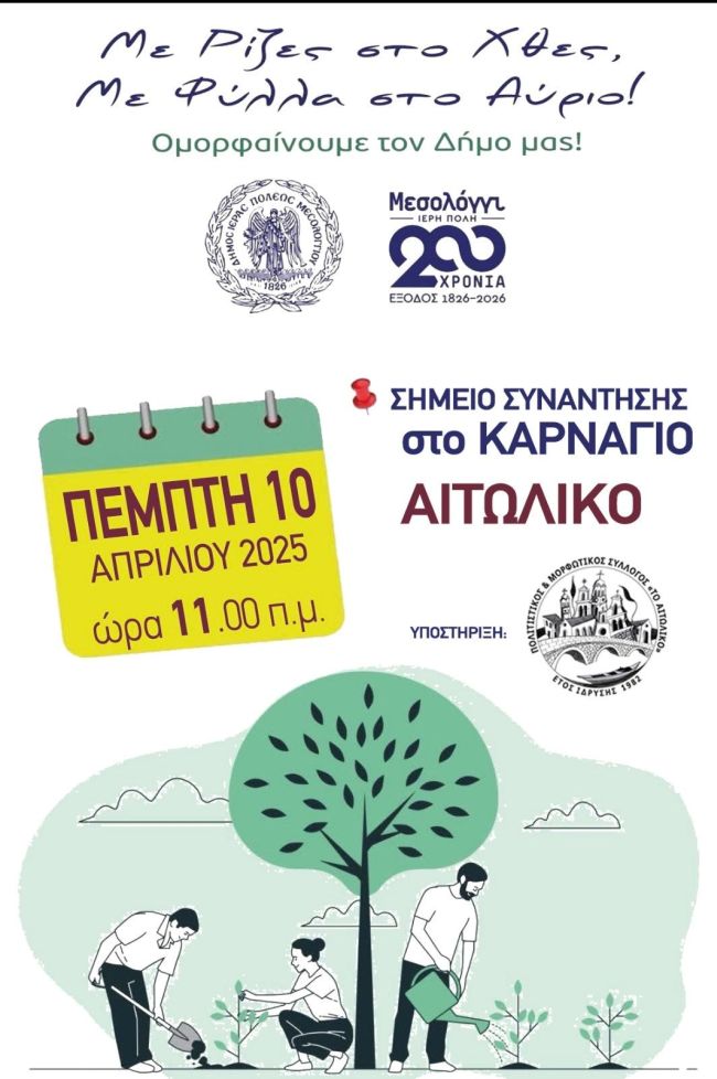 Μετά την πολύ επιτυχημένη δράση δενδροφύτευσης στο Μεσολόγγι, την προηγούμενη βδομάδα, ο Δήμος Ιερής Πόλης Μεσολογγίου ενώνει τις δυνάμεις του με τον Πολιτιστικό & Μορφωτικό Σύλλογο «Το Αιτωλικό» και προχωρά σε νέα δράση δενδροφύτευσης, στο Αιτωλικό, για την αισθητική και περιβαλλοντική αναβάθμιση της πόλης.