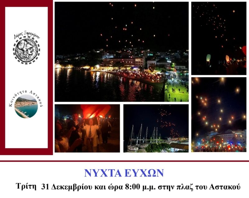 Ο Δήμος Ξηρομέρου και η Δημοτική Κοινότητα Αστακού, σας προσκαλούν να παραβρεθείτε τη Τρίτη 31 Δεκεμβρίου και ώρα 8:00 μ.μ. στην πλαζ του Αστακού, σε μία “Νύχτα ευχών”, όπου όλοι μαζί θα αποχαιρετίσουμε το 2024, αναμένοντας ένα φωτεινό 2025, με υγεία και ευτυχία για όλο τον κόσμο.