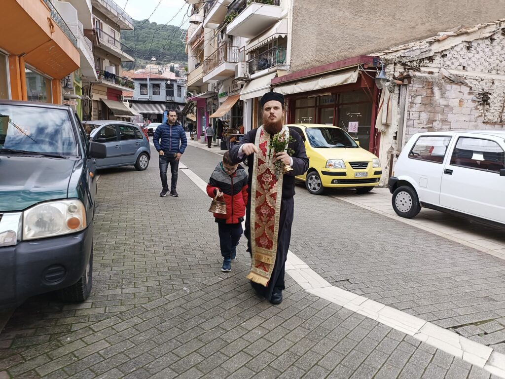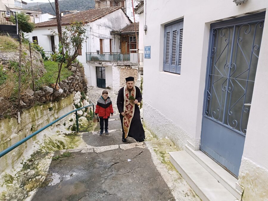 Το έθιμο με τον παπά που αγιάζει τα σπίτια βέβαια σήμερα γίνεται σε λίγες περιοχές. Μια από αυτές είναι η Αμφιλοχία όπου νωρίς το πρωί ο Πατήρ Γεώργιος πέρασε απο σπίτια και μαγαζιά κρατώντας το Σταυρό και ένα κλωνάρι βασιλικό και άγιασε για να φύγει το κακό, για υγεία και ευλογία