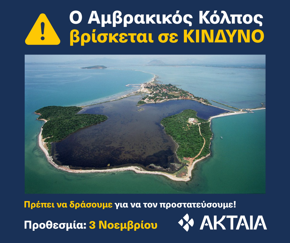 Ο πολύτιμος Αμβρακικός Κόλπος — προστατευόμενη περιοχή Natura 2000, υγρότοπος, κρίσιμος βιότοπος για πάνω από 290 είδη πουλιών και σπίτι για το απειλούμενο από εξαφάνιση είδος ρινοδέλφινων — αντιμετωπίζει μια ΜΑΖΙΚΗ επέκταση βιομηχανικών ιχθυοκαλλιεργειών, με στόχο την παραγωγή τσιπούρας και λαβρακιού μεγαλύτερη από αυτήν ολόκληρης της Γαλλίας! Και μάλιστα μέσα σε έναν σχεδόν κλειστό κόλπο όπου δεν θα έπρεπε καν να υπάρχουν ιχθυοκαλλιέργειες!