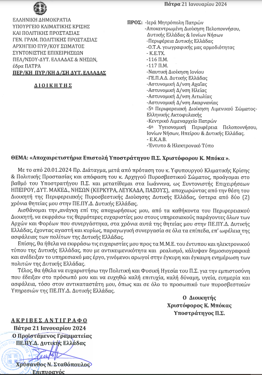Με απόφαση του Αρχηγού του Πυροσβεστικού Σώματος, Αντιστράτηγου Θεόδωρου Βάγια, τοποθετούνται οι κάτωθι δέκα (10) Υποστράτηγοι Π.Σ., ως ακολούθως: