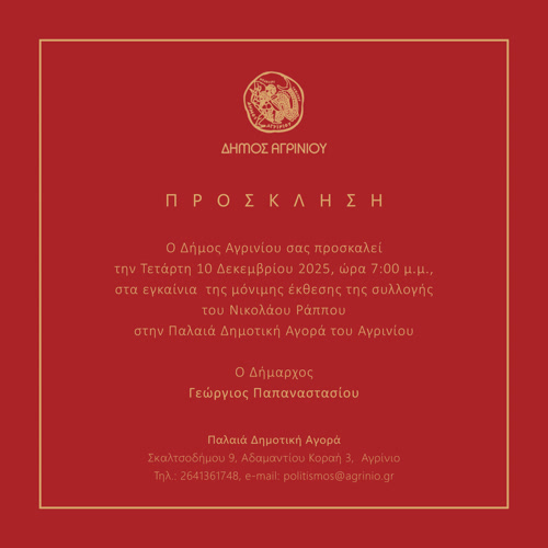Ο Δήμαρχος Αγρινίου προσκαλεί τους κατοίκους, τα Μέσα Ενημέρωσης και τους επισκέπτες της πόλης στα εγκαίνια της Μόνιμης Έκθεσης της Συλλογής Νικολάου Ράππου, την Τετάρτη 10 Δεκεμβρίου 2025, στις 7:00 το απόγευμα, στην Παλαιά Δημοτική Αγορά.