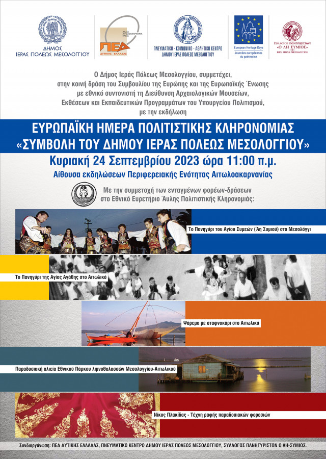 Ο Δήμος Ιεράς Πόλεως Μεσολογγίου, στα πλαίσια του εορτασμού των Ευρωπαϊκών Ημερών Πολιτιστικής Κληρονομιάς (ΕΗΠΚ) 2023, συμμετέχει στις θεματικές εκδηλώσεις που έχει σχεδιάσει το Υπουργείο Πολιτισμού με τιτλο: «Πολιτιστική Κληρονομιά και Παράδοση: Μαρτυρίες του χθες στο σήμερα» που θα πραγματοποιηθούν το διήμερο 22-24 Σεπτεμβρίου 2023 με την εκδήλωση: «Ευρωπαϊκή Ημέρα Πολιτιστικής Κληρονομιάς» – «Η Συμβολή του Δήμου Ιεράς Πόλεως Μεσολογγίου» που θα λάβει χώρα στις 24 Σεπτεμβρίου 2023, ημέρα Κυριακή και ώρα 11.00π.μ. στην αίθουσα εκδηλώσεων της Περιφερειακής Ενότητας Αιτωλοακαρνανίας.