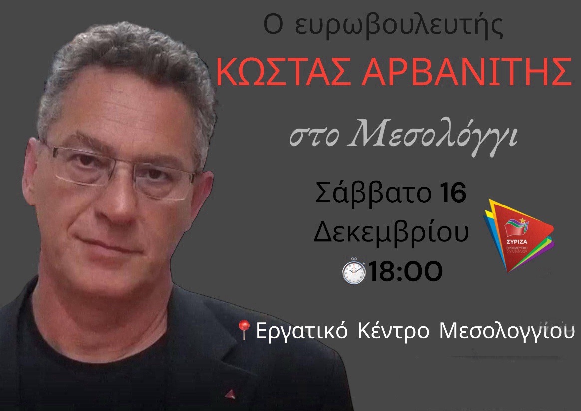 Ο ΣΥΡΙΖΑ ΠΣ Μεσολογγίου καλεί τα μέλη και τους φίλους του, στην εκδήλωση που διοργανώνει με ομιλητή τον ευρωβουλευτή Κώστα Αρβανίτη.