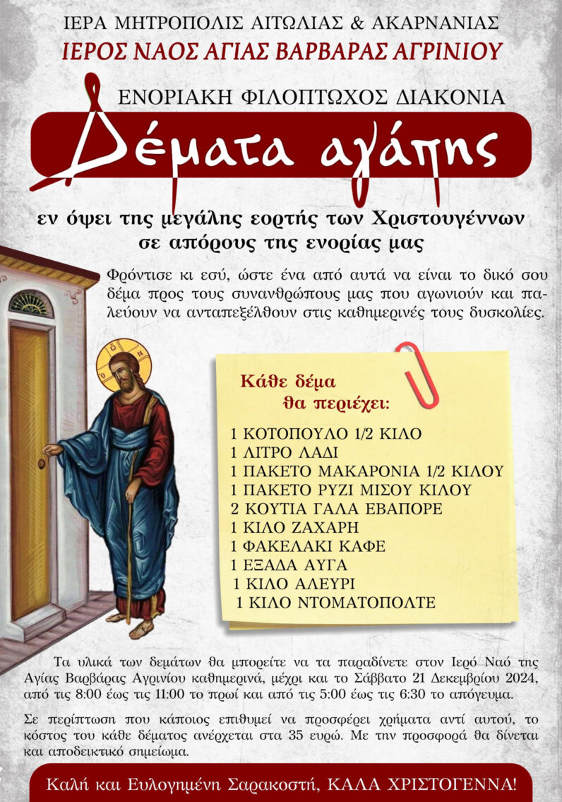 Η ενοριακή φιλόπτωχος διακονία του Ναού της Αγίας Βαρβάρας Αγρινίου για ακόμη μια χρόνια προχωρά σε δράσεις για την ανακούφιση των αναγκεμένων αδελφών μας.