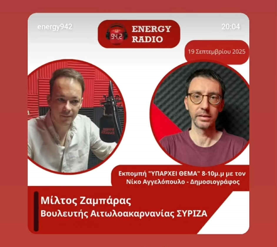 Στα τελευταία δημοσκοπικά ευρήματα στον απόηχο της ΔΕΘ, στις ζυμώσεις στον χώρο της κεντροαριστεράς, στο ενδεχόμενο επιστροφής του Αλέξη Τσίπρα καθώς και στα τρέχοντα κοινωνικά και πολιτικά ζητήματα, αναφέρθηκε με συνέντευξή του στον Energy 94,2 και την εκπομπή Υπάρχει θέμα, ο βουλευτής Αιτωλοακαρνανίας του ΣΥΡΙΖΑ Μίλτος Ζαμπάρας.
