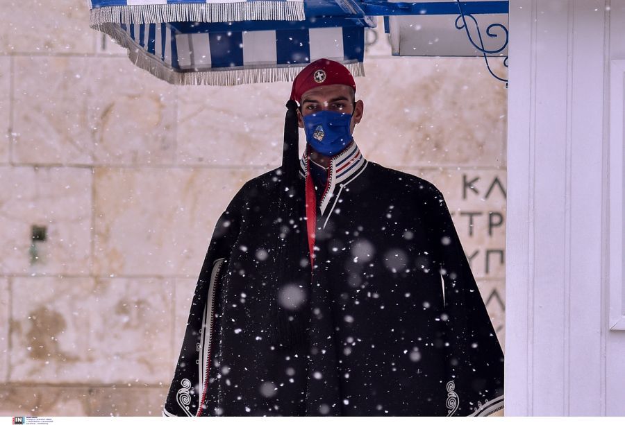 Το Σύνταγμα έχει ντυθεί στα λευκά και οι εύζωνες, όπως φαίνεται και στις φωτογραφίες, φόρεσαν τις σκούρες μπλε τσόχινες κάπες προκειμένου να αντέξουν τις χαμηλές θερμοκρασίες που έφερε η κακοκαιρία Ελπίς.