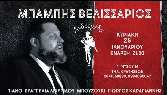 Θα τον απολαύσουμε σε μία παράσταση ταξιδεύοντάς μας με ελληνικό και διεθνές ρεπερτόριο αλλά και μεγάλα λαϊκά τραγούδια κορυφαίων Ελλήνων συνθετών με τη συνοδεία στο πιάνο της εξαιρετικής Ευαγγελίας Μαυρίδου και του Γιώργου Καραγιάννη στο μπουζούκι. Τιμές εισιτηρίων: 10€ Προπώληση 12€ Γενική είσοδος Σημεία προπώλησης: Moυσική Σκηνή Ανδρομέδα (Γ.Ρίτσου 16) Ξενόγλωσσο Βιβλιοπωλείο (Καζαντζή 25)