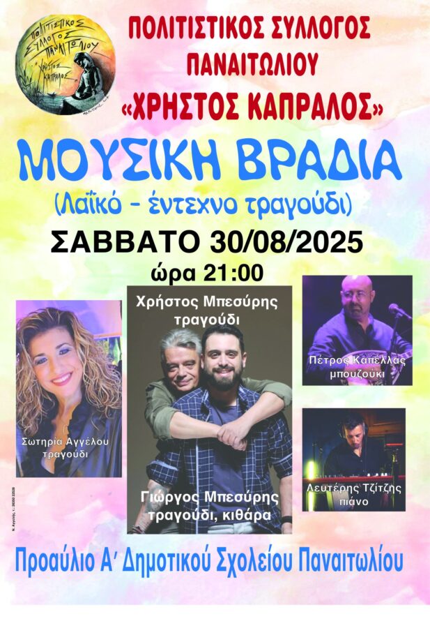 Ο Πολιτιστικός Σύλλογος Παναιτωλίου «Χρήστος Καπράλος», διοργανώνει το Σάββατο 30 Αυγούστου 2025 στο προαύλιο του Α΄ Δημοτικού Σχολείου Παναιτωλίου και ώρα 9 μ.μ μουσική βραδιά με λαϊκά και έντεχνα ελληνικά τραγούδια.