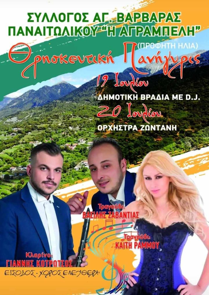 Ο ΣΥΛΛΟΓΟΣ ΑΓΙΑΣ ΒΑΡΒΑΡΑΣ ΠΑΝΑΙΤΩΛΙΚΟΥ “Η ΑΓΡΑΜΠΕΛΗ” ΣΑΣ ΠΡΟΣΚΑΛΕΙ ΣΤΗΝ ΘΡΗΣΚΕΥΤΙΚΗ ΠΑΝΗΓΥΡΙ ΠΟΥ ΔΙΟΡΓΑΝΩΝΕΙ ΠΡΟΣ ΤΙΜΗΝ ΤΟΥ ΠΡΟΦΗΤΗ ΗΛΙΑ ΣΤΙΣ 19 ΚΑΙ ΣΤΙΣ 20 ΙΟΥΛΙΟΥ ΣΤΗ ΠΛΑΤΕΙΑ ΤΟΥ ΧΩΡΙΟΥ. ΣΤΙΣ 19 ΙΟΥΛΙΟΥ ΔΙΑΣΚΕΔΑΖΟΥΜΕ ΜΕ DJ ΕΝΩ ΣΤΙΣ 20 ΙΟΥΛΙΟΥ ΜΕ ΔΗΜΟΤΙΚΗ ΟΡΧΗΣΤΡΑ. ΣΤΟ ΚΛΑΡΙΝΟ Ο ΓΙΑΝΝΗΣ ΚΟΤΡΩΤΣΟΣ ΚΑΙ ΣΤΟ ΤΡΑΓΟΥΔΙ Η ΚΑΙΤΗ ΡΑΜΜΟΥ ΚΑΙ Ο ΒΑΣΙΛΗΣ ΖΑΒΑΝΤΙΑΣ. ΕΙΣΟΔΟΣ ΚΑΙ ΧΟΡΟΣ ΕΛΕΥΘΕΡΑ. ΤΙΜΕΣ ΣΥΛΛΟΓΟΥ. ΣΑΣ ΠΕΡΙΜΕΝΟΥΜΕ ΟΛΟΥΣ ΝΑ ΠΕΡΑΣΟΥΜΕ ΔΥΟ ΑΞΕΧΑΣΤΕΣ ΒΡΑΔΙΕΣ ΜΕΧΡΙ ΤΟ ΠΡΩΙ.