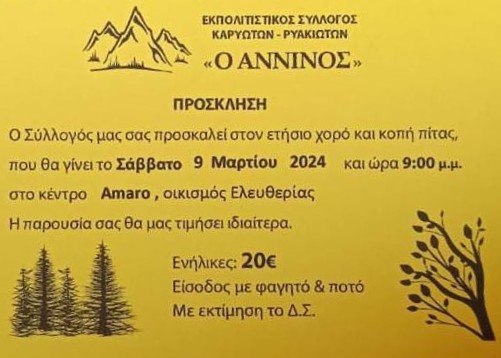 Το Διοικητικό Συμβούλιο του Συλλόγου Καρυωτών – Ρυακιωτών « Ο ΑΝΝΙΝΟΣ» σας προσκαλούν στον ετήσιο χορό και στην κοπή της πίτας, που θα πραγματοποιηθεί το Σάββατο 9 Μαρτίου 2024 και ώρα 9:00 μ.μ. στο κέντρο Αmaro, οικισμός Ελευθερίας.