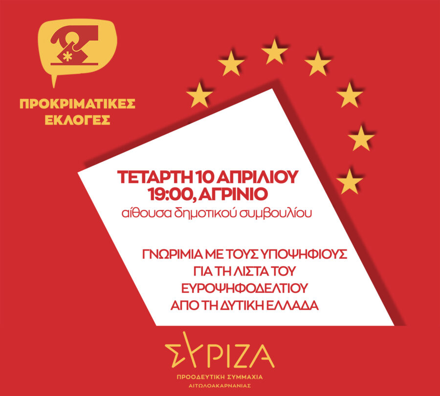 Ο ΣΥΡΙΖΑ-ΠΣ Αιτωλ/νίας καλεί τα μέλη και τους φίλους για μια πρώτη γνωριμία με τους υποψήφιους Ευρωβουλευτές του κόμματος στην Περιφέρεια Δυτικής Ελλάδας!