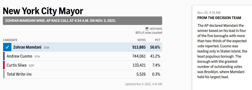 — Zohran Kwame Mamdani (@ZohranKMamdani) November 5, 2025