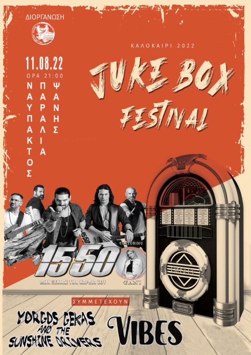 Αυτό το καλοκαίρι στη Ναύπακτο, η μουσική έχει τον πρώτο λόγο! Στις 11 Αυγούστου, στην παραλία Ψανής οι 15 50 και μαζί τους οι Yorgos Gekas & The Sunshine Drivers και οι VIBES θα δώσουν το δικό τους ρυθμό στο JUKE BOX FESTIVAL!