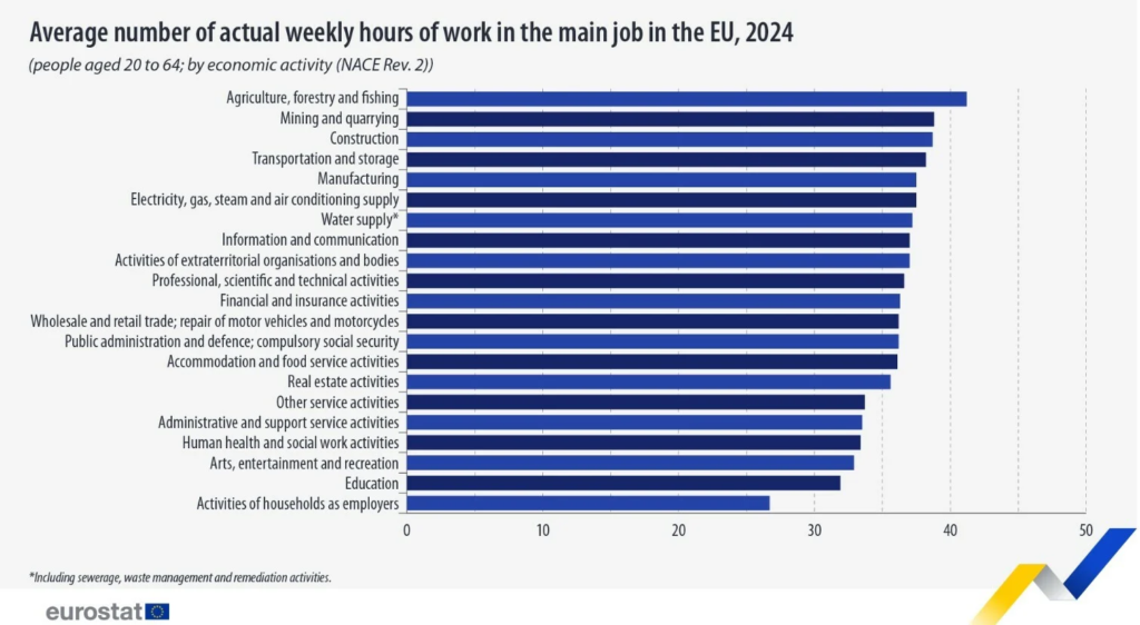 Οι δραστηριότητες που καταγράφουν τη μεγαλύτερη εβδομάδα εργασίας στην Ελλάδα εντοπίζονται στη γεωργία, τη δασοκομία και την αλιεία, με τον μέσο όρο στις 41,2 ώρες. Τα ορυχεία, τα λατομεία και οι κατασκευές εμφανίζουν επίσης υψηλούς μέσους όρους.