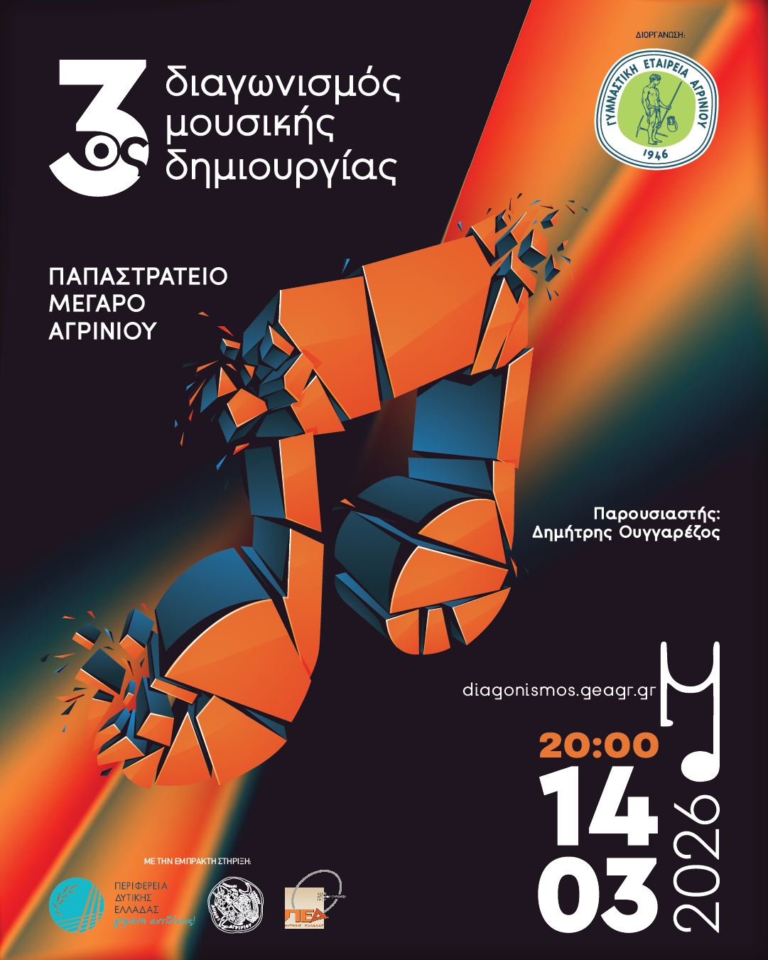 Ο 3ος Διαγωνισμός Μουσικής Δημιουργίας, που διοργανώνει η Γυμναστική Εταιρεία Αγρινίου σε συνεργασία με την Περιφέρεια Δυτικής Ελλάδας, το Δήμο Αγρινίου και την Π.Ε.Δ. Δυτικής Ελλάδας, έχει περάσει στην τελική του φάση και απομένουν λίγες ημέρες για τη διεξαγωγή του.
