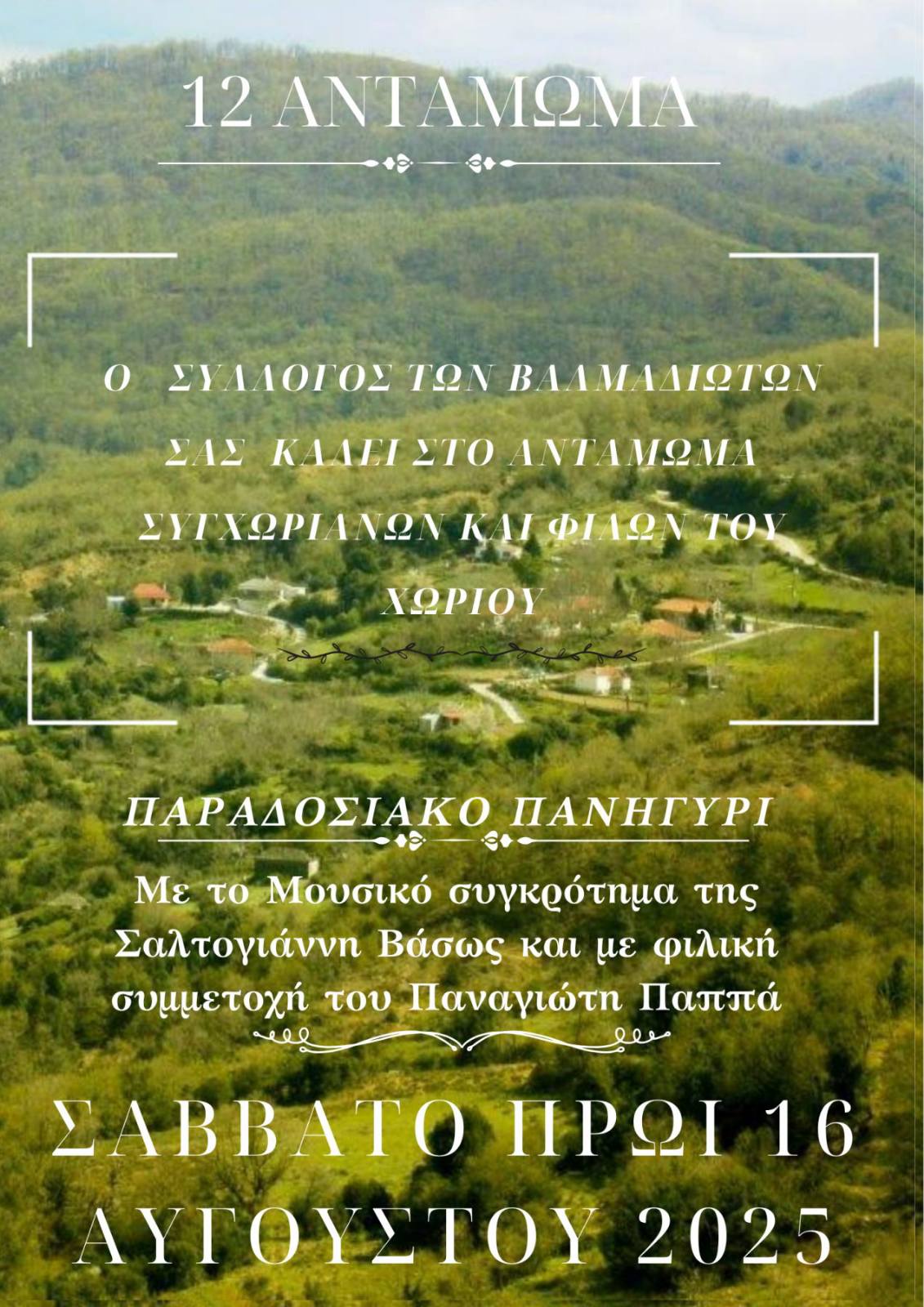 Η ομάδα Βαλμαδιωτών σας καλεί στο 12ο Αντάμωμα το πρωινό του Σαββάτου 16 Αυγούστου 2025 στο παραδοσιακό πανηγύρι στον Άγιο Δημήτριο Βαλμάδας με το συγκρότημα της Βάσως Σαλτογιάννη καιτην φιλική συμμετοχή του Παναγιώτη Παππά.