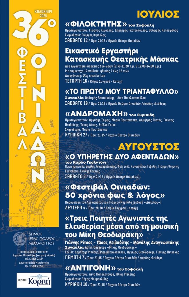 Με την παράσταση «Αντιγόνη» του Σοφοκλή ρίχνει αυλαία το 36o Φεστιβάλ Αρχαίου Θεάτρου Οινιαδών, την Κυριακή 10 Αυγούστου 2025 στις 21:15, στο αρχαίο θέατρο.