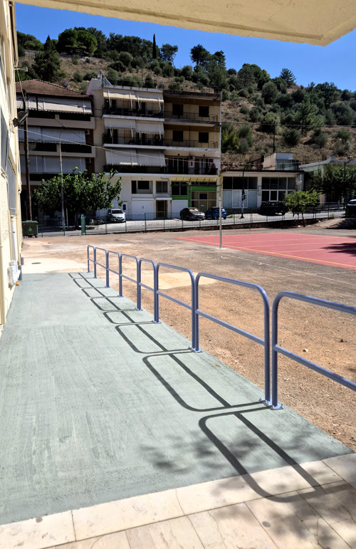 • Ράμπες στις δύο εισόδους του σχολείου προσβάσιμες για ΑΜΕΑ και προσθήκη ράμπας στην εσωτερική σκάλα για μεταφορά αναπηρικού αμαξιδίου στις σχολικές αίθουσες