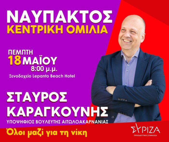 Σας καλούμε σήμερα στις 8 το βράδυ στην κεντρική ομιλία του Σταύρου Καραγκούνη, υποψηφίου βουλευτή του ΣΥΡΙΖΑ ΠΣ στη Ναύπακτο, στο Lepanto Beach Hotel .
