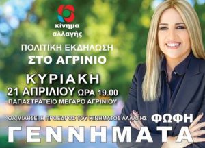 Την Κυριακή των Βαΐων 21 Απριλίου 2019 η Πρόεδρος του Κινήματος Αλλαγής, Φώφη Γεννηματά, θα πραγματοποιήσει επίσημη επίσκεψη στο Νομό Αιτωλοακαρνανίας.
