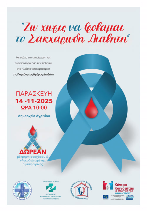 Ο Ιατρικός Σύλλογος Αγρινίου, σε συνεργασία με το νοσηλευτικό προσωπικό του Κοινωνικού Ιατρείου της Διεύθυνσης Κοινωνικής Προστασίας και Δημόσιας Υγείας του Δήμου Αγρινίου, τον Σύλλογο Διαβητικών Ν.Αιτωλ/νιας «Γλυκιά Οικογένεια« και το Κέντρο Κοινότητας του Δήμου Αγρινίου, με αφορμή την Παγκόσμια Ημέρα Διαβήτη, σας προσκαλεί να συμμετάσχετε στη δράση ενημέρωσης και ευαισθητοποίησης που θα πραγματοποιηθεί την Παρασκευή 14 Νοεμβρίου 2025, από 10:00 έως 12:00, μπροστά από το Δημαρχείο Αγρινίου.