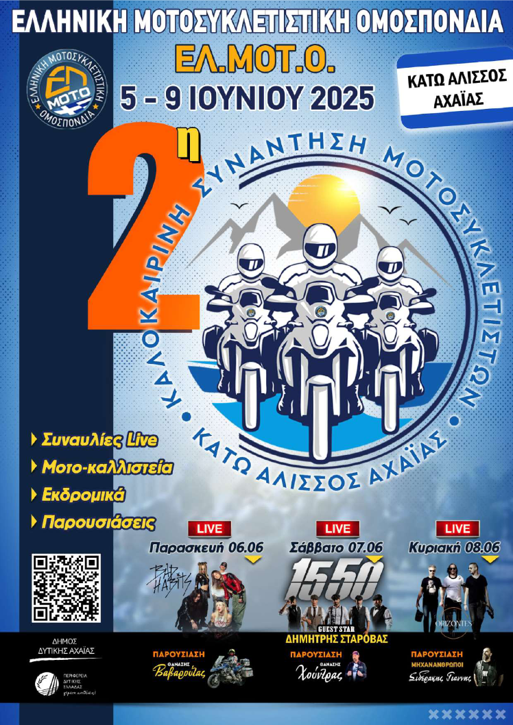 Η Ελληνική Μοτοσυκλετιστική Ομοσπονδία (ΕΛ.ΜΟΤ.Ο.) συνδιοργανώνει με την Περιφέρεια Δυτικής Ελλάδας και τον Δήμο Δυτικής Αχαϊας, τη 2η Πανελλήνια Καλοκαιρινή Συνάντηση Μοτοσικλετιστών, ένα γεγονός εθνικής εμβέλειας στον χώρο του μηχανοκίνητου αθλητισμού.