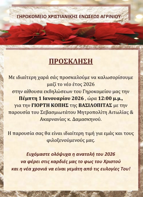 Την 1η Ἰανουαρίου 2026 εορτάζει ο ιερός ναός του Αγίου Βασιλείου στο Γηροκομεῖο της Χριστιανικής Ενώσεως Αγρινίου.
