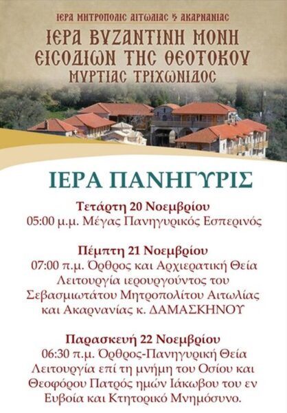 Πανηγυρίζει η Ιερά Μονή Μυρτιάς στις 21 Νοεμβρίου
