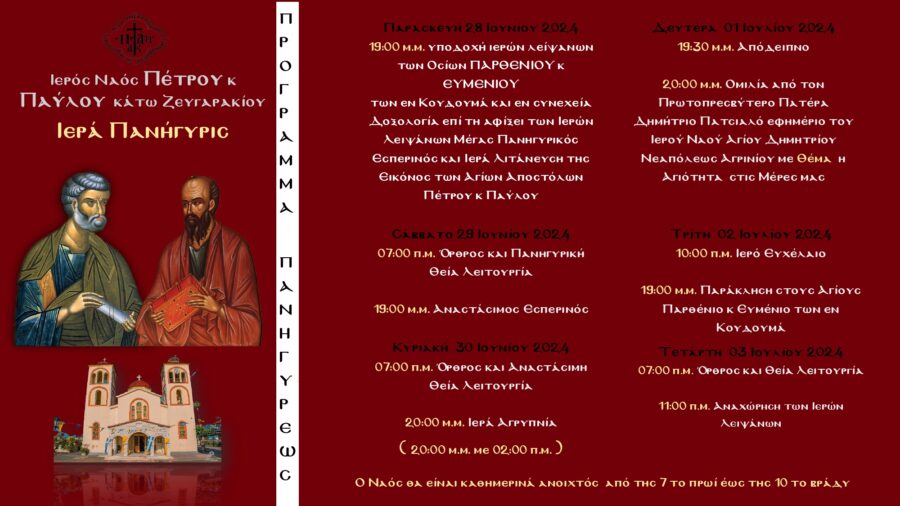 των εν Κουδουμά της Ιεράς Μονής Κουδουμά Κρήτης ΠΑΡΑΣΚΕΥΗ 28 Ιουνίου 2024 19:00 μ.μ. εν συνεχεία Δοξολογία επί τη αφίξει των ιερών λείψανων και Μέγας πανηγυρικός Εσπερινός.