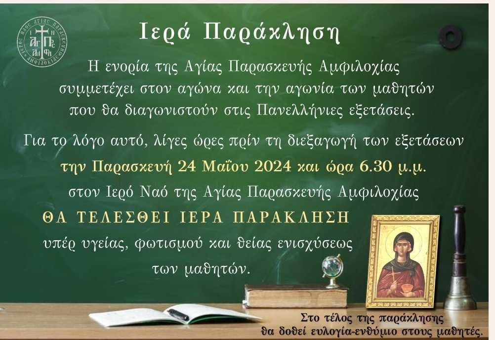 Ιδιαιτέρως τη Παρασκευή 24 Μαΐου 2024 και ώρα 6.30:00 το απόγευμα θα τελεστεί παράκληση στην Αγία Παρασκευή Αμφιλοχίας η οποία θα είναι αφιερωμένη σε όλους τους Υποψηφίους