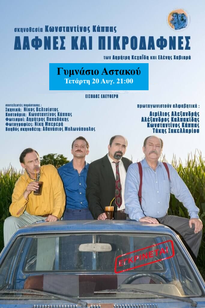 Ο Δήμος Ξηρομέρου φιλοξενεί την παράσταση του Δη.Πε.Θε. Αγρινίου «ΔΑΦΝΕΣ ΚΑΙ ΠΙΚΡΟΔΑΦΝΕΣ» των Δημήτρη Κεχαΐδη και Ελένης Χαβιαρά, σε σκηνοθεσία Κώστα Κάππα, στο πλαίσιο της θερινής του περιοδείας για το Καλοκαίρι 2025.