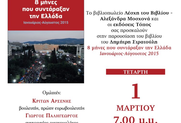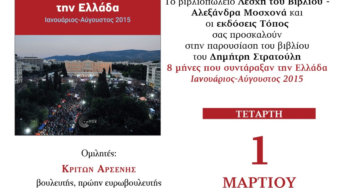 Την Τετάρτη 1 Μαρτίου 2023 στο Αγρίνιο θα πραγματοποιηθεί στις 7μμ, στην Αίθουσα Συνεδριάσεων του Δημοτικού Συμβουλίου Αγρινίου-π. Τράπεζα Ελλάδος, η παρουσίαση του νέου βιβλίου του Δημήτρη Στρατούλη «8 μήνες που συντάραξαν την Ελλάδα, Ιανουάριος-Αύγουστος 2015!».