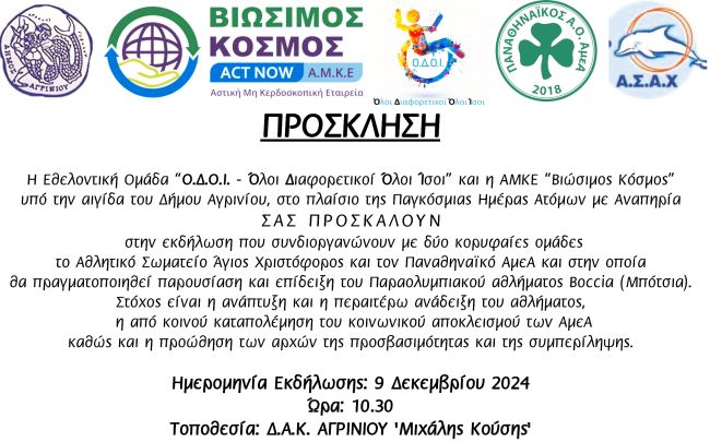 Η Εθελοντική Ομάδα “Ο.Δ.Ο.Ι. – Όλοι Διαφορετικοί Όλοι Ίσοι” και η ΑΜΚΕ «Βιώσιμος Κόσμος» υπό την αιγίδα του Δήμου Αγρίνιου συνδιοργανώνουν εκδήλωση με το Αθλητικό Σωματείο Άγιος Χριστόφορος και τον Παναθηναϊκό ΑμεΑ, στο πλαίσιο της Παγκόσμιας Ημέρας Ατόμων με Αναπηρία.