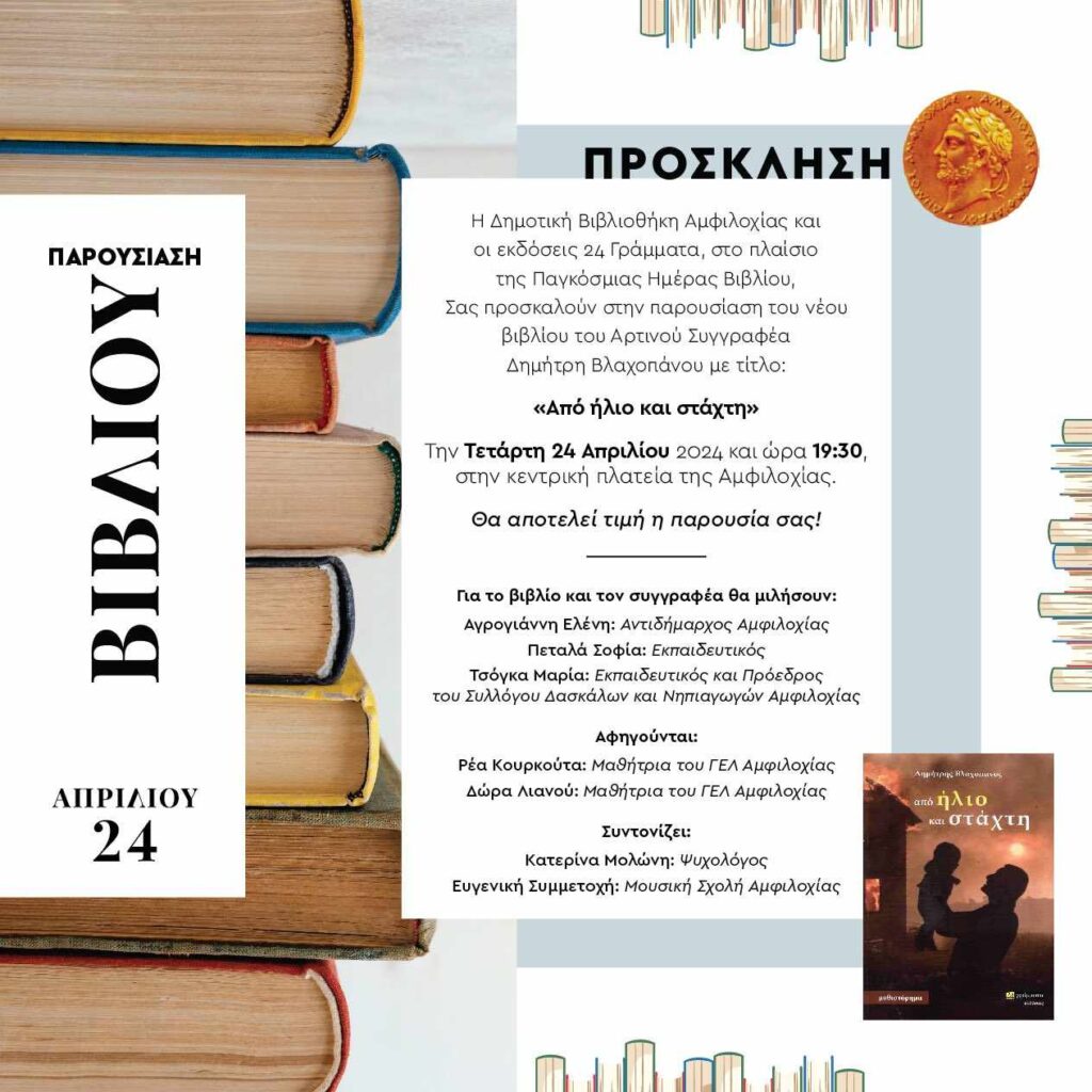 Η Δημοτική Βιβλιοθήκη Αμφιλοχίας και οι εκδόσεις 24 Γράμματα θα δημιουργήσουν την Τετάρτη 24 Απριλίου και ώρα 19:30 ένα υπαίθριο αναγνωστήριο στην κεντρική πλατεία της Αμφιλοχίας για την παρουσίαση του νέου βιβλίου του Αρτινού Συγγραφέα Δημητρίου Βλαχοπάνου με τίτλο: «Από ήλιο και στάχτη» και σας προσκαλούν σε μια βραδιά με πρωταγωνιστές το βιβλίο και τη μουσική.