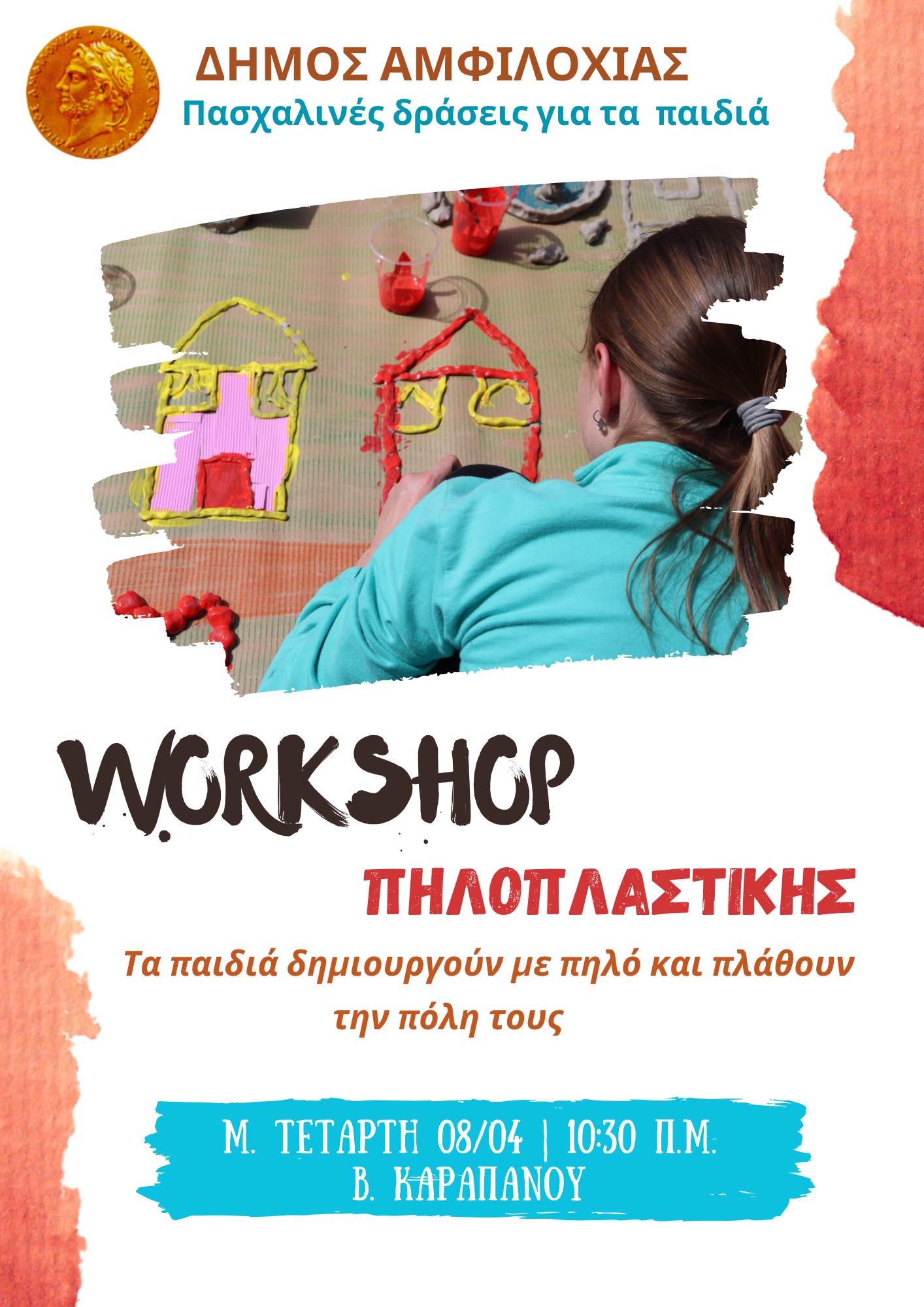 Στη συνέχεια θα πραγματοποιηθεί καλλιτεχνική δράση, και συγκεκριμένα εργαστήρι πηλοπλαστικής, όπου τα παιδιά θα πλάσουν με πηλό σε έναν υπαίθριο καμβά από χαρτόνι την πόλη τους, παράλληλα με δράση face painting για μικρούς και μεγάλους με ανοιξιάτικα και πασχαλινά χρώματα.