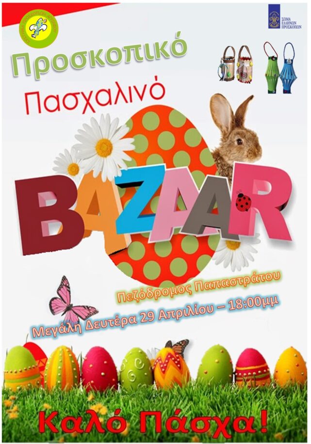 Η Επιτροπή Κοινωνικής Συμπαράστασης του 1ου Συστήματος Προσκόπων Αγρινίου, σας καλεί στο Πασχαλινό Bazaar των Προσκόπων τη Μεγάλη Δευτέρα 29 Απριλίου και ώρα 18:00 μμ, στον πεζόδρομο Παπαστράτου.