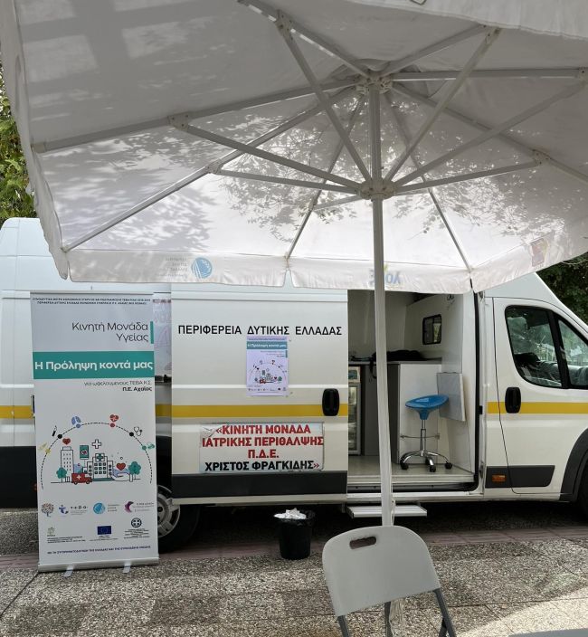 Ολοκληρώθηκε με την συμμετοχή εκατοντάδων ωφελούμενων και την παροχή περισσότερων από 1.000 υπηρεσιών πρόληψης και προαγωγής υγείας, η δράση «Η Πρόληψη Κοντά Μας», που αφορούσε σε δωρεάν προληπτικούς ιατρικούς ελέγχους, με τη χρήση της Κινητής Μονάδας Υγείας της Περιφέρειας Δυτικής Ελλάδας, για ωφελούμενους ΤΕΒΑ των τριών Κοινωνικών Συμπράξεων Π.Ε. Αχαΐας, Ηλείας και Αιτωλοακαρνανίας.
