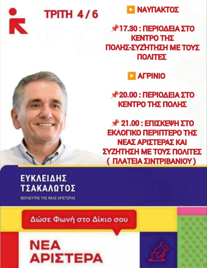 Λίγες μόλις μέρες πριν από της ευρωεκλογές της 9ης Ιουνίου, η Νομαρχιακή Οργάνωση Αιτωλοακαρνανίας έχει προγραμματίσει για την Τρίτη 4 Ιουνίου 2024, επίσκεψη του βουλευτή και κοινοβουλευτικού εκπροσώπου του κόμματος μας Ευκλείδη Τσακαλώτου.