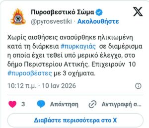Χωρίς τις αισθήσεις της ανασύρθηκε ηλικιωμένη κατά τη διάρκεια πυρκαγιάς που ξέσπασε σε διαμέρισμα πολυκατοικίας στο Περιστέρι. Όπως έγινε γνωστό από την πυροσβεστική, η φωτιάεκδηλώθηκε λίγο πριν τις 9:00 σε διαμέρισμα 2ου ορόφου, επί της οδού Ταινάρου στο Περιστέρι. Οι πυροσβεστικές δυνάμεις που μετέβησαν στο σημείο για την κατάσβεση της πυρκαγιάς εντόπισαν χωρίς τις αισθήσεις της μια γυναίκα -περίπου 90 ετών- εντός του διαμερίσματος. Η πυρκαγιά έχει τεθεί υπό μερικό έλεγχο και στο σημείο επιχειρούν 10 πυροσβέστες με 3 οχήματα.