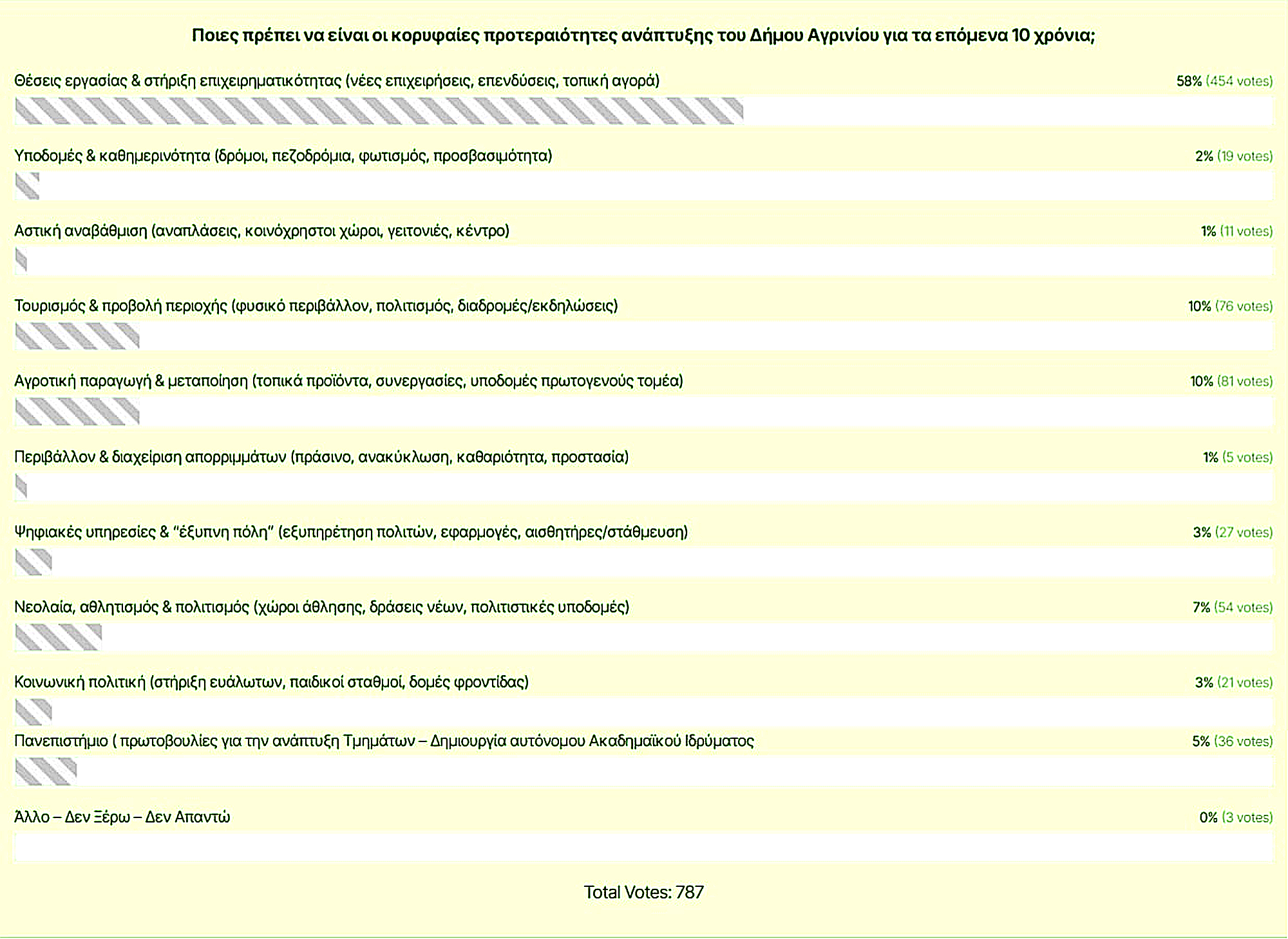 Η ηλεκτρονική δημοσκόπηση που παρουσιάζεται στην εικόνα αποτυπώνει με σαφήνεια τις αντιλήψεις και τις προτεραιότητες των πολιτών του Δήμου Αγρινίου αναφορικά με την αναπτυξιακή πορεία της περιοχής για την επόμενη δεκαετία. Με συνολικό αριθμό συμμετεχόντων τους 787 πολίτες, τα αποτελέσματα αποκαλύπτουν μια έντονη έμφαση σε ζητήματα οικονομικής ανάπτυξης και απασχόλησης, γεγονός που αντανακλά τις βασικές κοινωνικές και οικονομικές ανάγκες της τοπικής κοινωνίας.