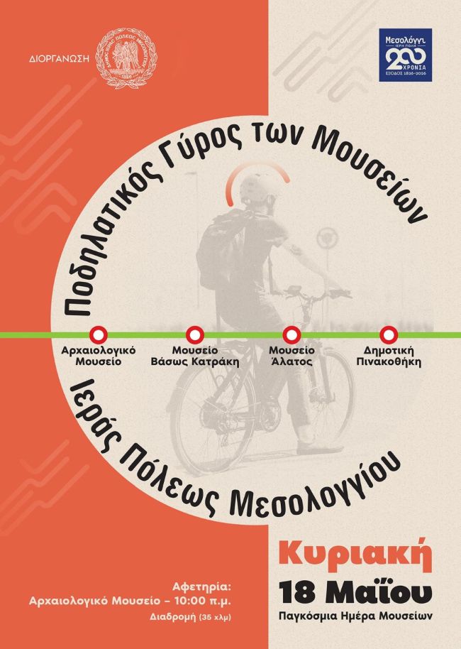 Ο Δήμος Ιεράς Πόλεως Μεσολογγίου διοργανώνει την Κυριακή, 18 Μαΐου 2025, Παγκόσμια Ημέρα των Μουσείων, τον «Ποδηλατικό γύρο των Μουσείων Ιεράς Πόλεως Μεσολογγίου, στο πλαίσιο της Επετείου του εορτασμού των Διακοσίων Ετών της Εξόδου του Μεσολογγίου το 2026.