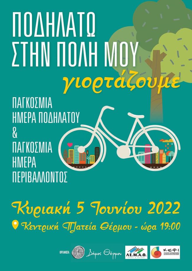 Στο πλαίσιο του εορτασμού της Παγκόσμιας Ημέρας Περιβάλλοντος συνδιοργανώνεται από τον Δήμο Θέρμου, τη Λέσχη Μεικτού Αθλητισμού Θέρμου (ΛΕ.Μ.Α.Θ.) και τον Σύλλογο Καρκινοπαθών Εθελοντών Φίλων Ιατρών Αθηνών, η εκδήλωση «ΠΟΔΗΛΑΤΩ ΣΤΗΝ ΠΟΛΗ ΜΟΥ» η οποία θα πραγματοποιηθεί την Κυριακή 5 Ιουνίου 2022 και ώρα 19:00 στην κεντρική πλατεία του Θέρμου.