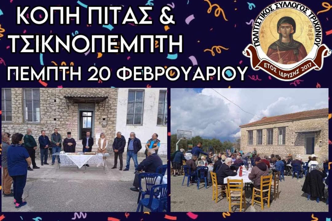 Ο Πολιτιστικός και Εξωραϊστικός Σύλλογος Τριχωνίου “η Αγία Παρασκευή” σας προσκαλεί στην κοπή της πρωτοχρονιάτικης πίτας του, η οποία θα πραγματοποιηθεί την Πέμπτη 20 Φεβρουαρίου 2025 στις 11:00 π.μ., στον προαύλιο χώρο του πρώην Δημοτικού Σχολείου Τριχωνίου.