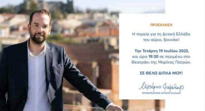 Την πρώτη του προεκλογική συγκέντρωση θα πραγματοποιήσει την Τετάρτη 19 Ιουλίου 2023 στην Πάτρα, ο Περιφερειάρχης Δυτικής Ελλάδας, Νεκτάριος Φαρμάκης.